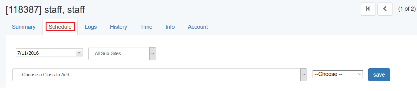 - Click the Staff>Schedule tab. In the form at the top of the screen,