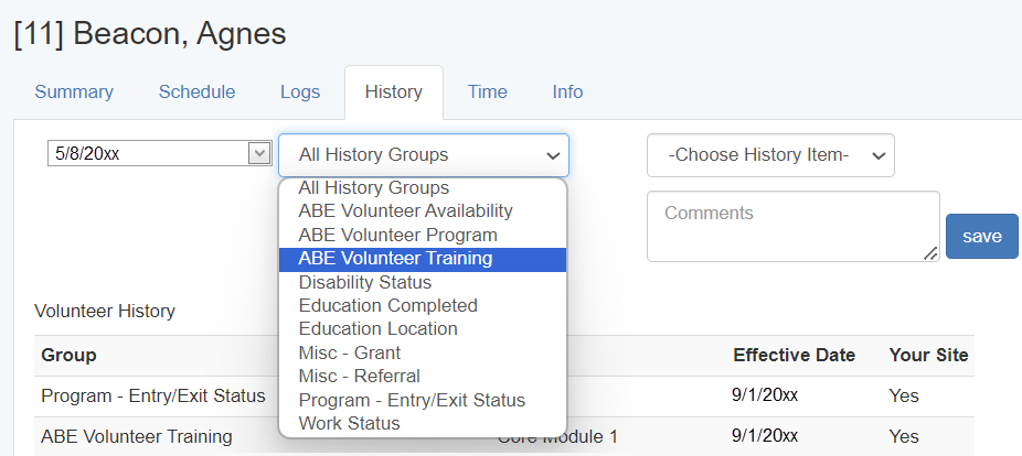 • From the All History Groups menu, choose ABE Volunteer Training