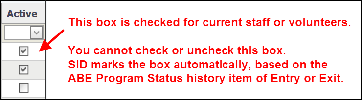 Note: you cannot check or uncheck the Active box. SiD marks it automatically by looking at the Volunteer>History tab. The most recent ABE Program Status history item of Entry or Exit determines whether the Active box is marked.